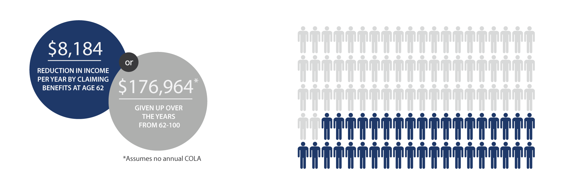 Let's assume that your age 66 projected monthly retirement benefit is $2,482. Claiming benefits at age 62 reduces the monthly check from $2,482, to $1,800.